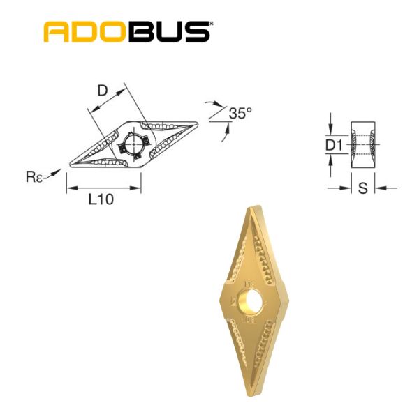 – Mảnh tiện hình thoi V có 2 góc ở đỉnh là 35°.